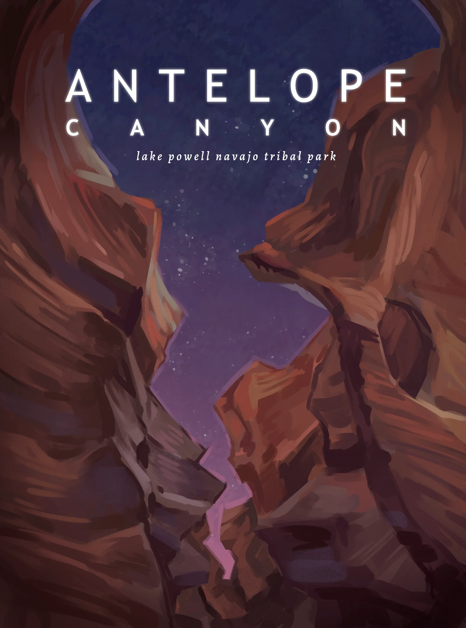 A hand painted illustration print of Antelope Canyon Park at night. 11x15 on 100lb matte cardstock.