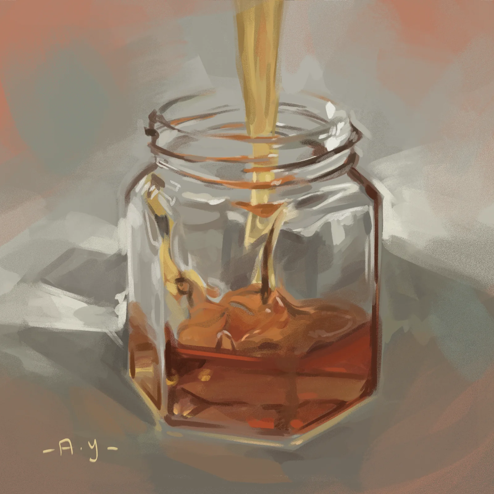 A hand painted still life of honey in a glass jar. 6x6 on 100lb matte cardstock.