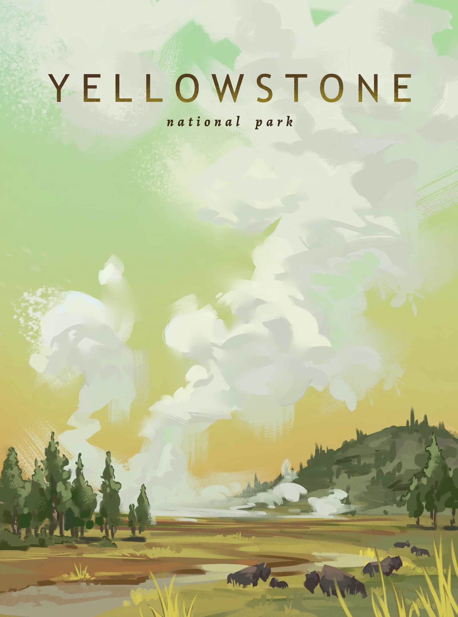 A hand painted illustration print of Yellowstone National Park. 11x15 on 100lb matte cardstock.